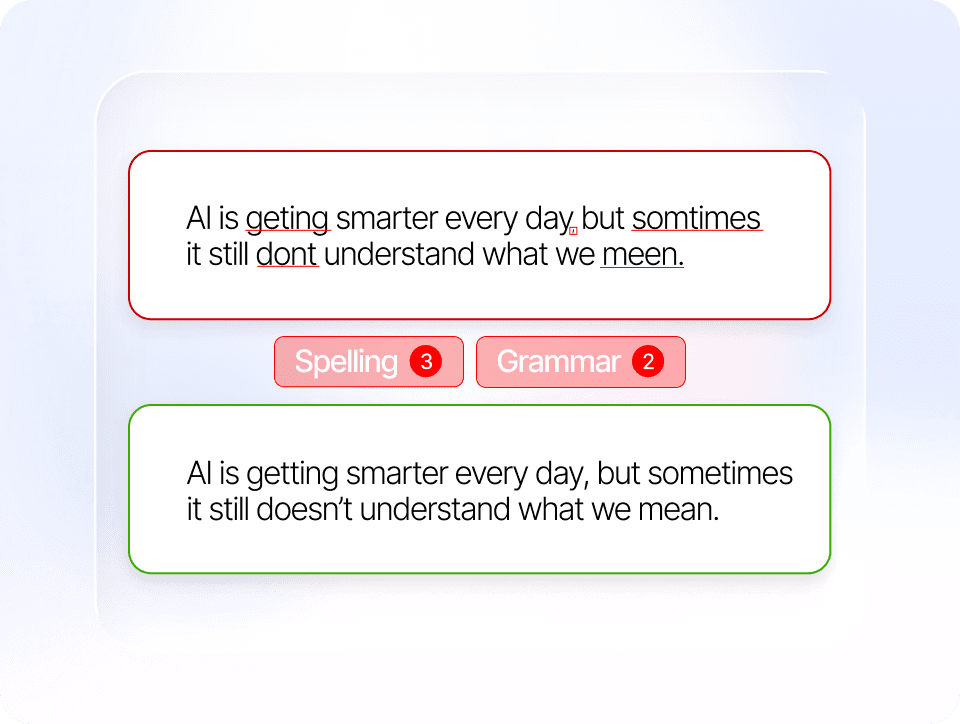 Our free grammar checker quickly detects spelling errors, typos, and basic grammar slips that can make writing look unprofessional. From incorrect verb forms to confusing homophones, this online grammar checker ensures your text is polished.
